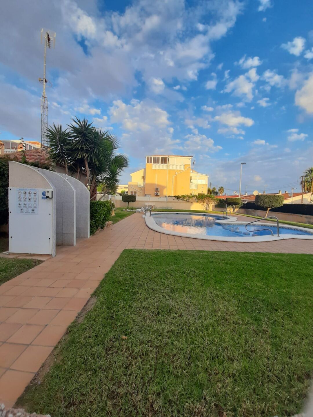 Vivienda con orientación Sur, 66m2 construidos, divididos en dos habitaciones y dos baños, salón comedor con cocina independiente y galería. La propiedad tiene una plaza de aparcamiento en parcela y jardín enlosado, además un solárium. La vivienda se encuentra en estado perfecto, se vende semiamueblada y sin efectos personales, lista para entrar a vivir, situada cerca de servicios. La comunidad dispone de piscina privada.